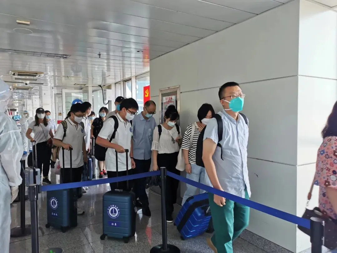 △來自武漢的核酸檢測人員抵達新疆烏魯木齊地窩堡國際機場。