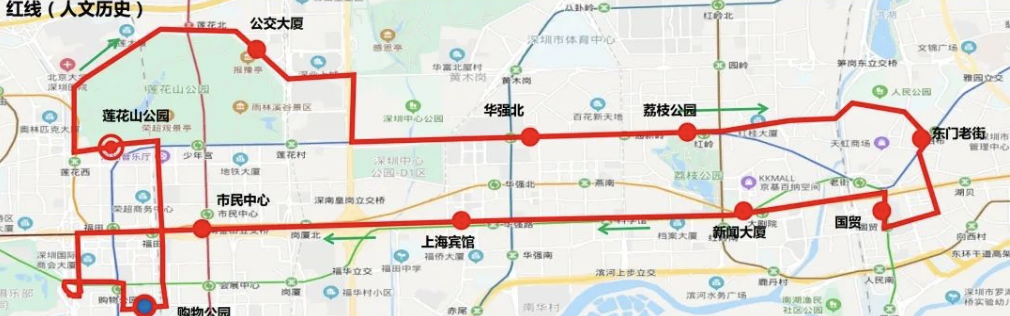 停靠站點:蓮花山公交總站→公交大廈→華強北→荔枝公園→東門老街→國貿(mào)→新聞大廈→上海賓館→市民中心→購物公園地鐵站→蓮花山公園→蓮花山公交總站