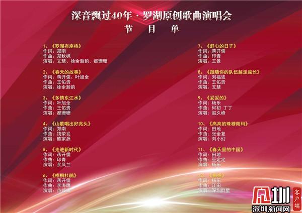 歌曲創(chuàng)作是深圳市羅湖區(qū)的強項,中國大陸的流行歌曲即由此發(fā)端。四十年來,《春天的故事》、《走進新時代》、《跟隨你的隊伍越走越長》、《山歌唱出好兆頭》等一大批膾炙人口的羅湖原創(chuàng)歌曲,經(jīng)由影視、廣播等媒體傳播,風靡大江南北,反映了時代劇變,表達了人民心聲。此次演唱會,精選了其中的12首歌曲,由熊家源、余鳳蘭、劉小幻、范媛媛、楊樂、支慧、趙久峰、都園園、王景、徐余瀚韻等數(shù)位深圳歌唱家傾情演繹,其中既有創(chuàng)作于上世紀的歌曲,也有近年來新創(chuàng)作的歌曲,堪稱一場聲樂盛宴。