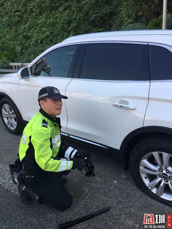 事情發(fā)生在10月11日早上10時(shí)30分許,劉先生駕車(chē)出外辦事,車(chē)輛行駛至東環(huán)高架西往東方向時(shí),突然一聲巨響左后輪輪胎爆裂車(chē)輛半路拋錨,當(dāng)時(shí)正值交通早高峰,過(guò)往車(chē)輛不斷,故障車(chē)輛停在道路中間導(dǎo)致路段交通擁堵,車(chē)主劉先生一時(shí)間不知所措,只能留在原地等待救援。此時(shí)正在執(zhí)行巡邏任務(wù)的羅湖交警鐵騎組長(zhǎng)陳展廷見(jiàn)狀,立即停下警車(chē)上前查看情況,了解情況后,為了緩解該路段的交通擁堵,防止出現(xiàn)交通意外,陳展廷立即讓劉先生把車(chē)??吭谧钣覀?cè)車(chē)道,然后安排隊(duì)員用警車(chē)在故障車(chē)輛周邊設(shè)置出了安全警戒區(qū)域,另一位隊(duì)員則對(duì)過(guò)往車(chē)輛進(jìn)行指揮疏導(dǎo)及勸慰駕駛?cè)瞬灰保诎踩珔^(qū)域等待,陳展廷則俯下身為爆胎車(chē)輛更換輪胎。約15分鐘的忙碌后,三位鐵騎隊(duì)員已滿身是汗,但在他們的密切協(xié)調(diào)配合下,快速幫助駕駛?cè)藙⑾壬鷶[脫困境,險(xiǎn)情在最短時(shí)間內(nèi)被及時(shí)排除,道路交通秩序也恢復(fù)正常,這暖心一幕讓劉先生很是感動(dòng),緊緊握著陳展廷同志的手連聲表示感謝。