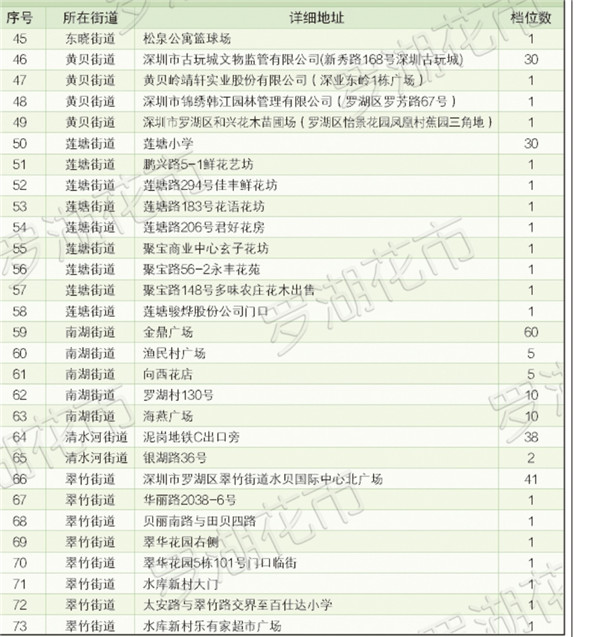 羅湖區(qū)共開設(shè)近500個(gè)花市鋪位,遍布全區(qū)10個(gè)街道,近40個(gè)社區(qū)。同時(shí),羅湖區(qū)還特別制作了花市地圖,最大限度的方便市民就近購(gòu)花。