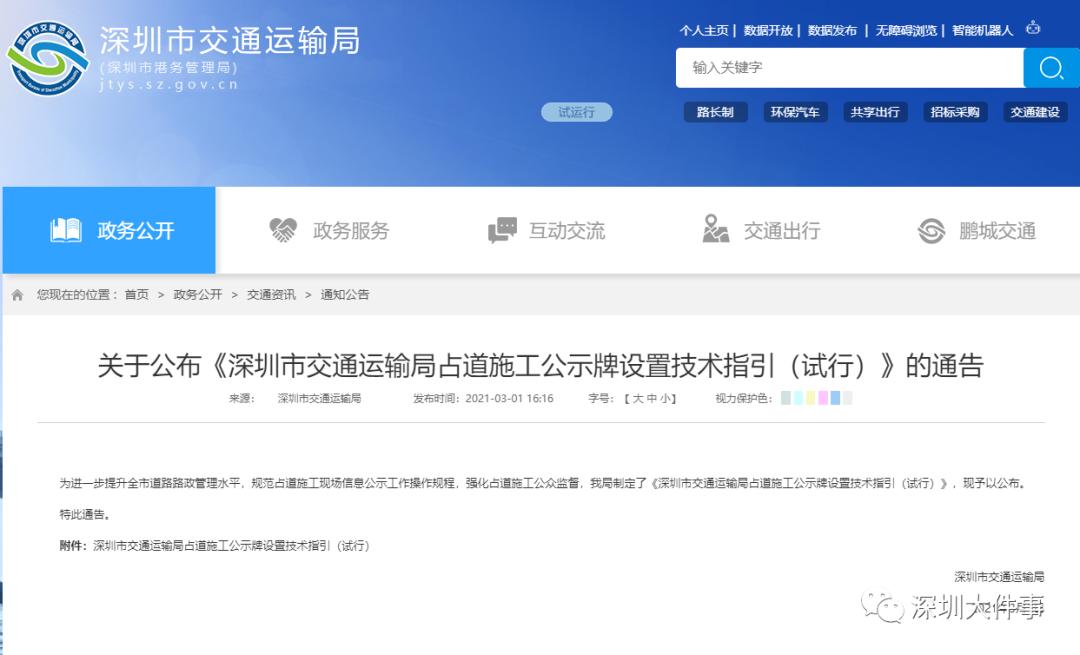 為加強(qiáng)道路管理,規(guī)范道路占用、挖掘行為,強(qiáng)化占道施工公眾監(jiān)督,深圳市交通運(yùn)輸局編制了《占道施工公示牌設(shè)置技術(shù)指引(試行)》(以下簡稱《指引》),對占道施工公示牌設(shè)置要求,張貼范圍都有了明確的標(biāo)準(zhǔn)和要求。