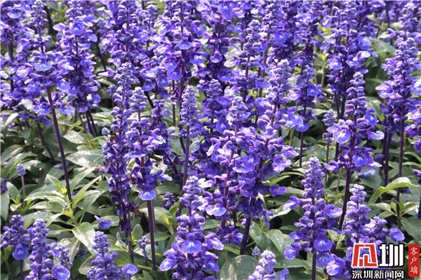 繁花似錦,花香滿(mǎn)園,而紫色的大花飛燕草在陽(yáng)光下最為亮眼。