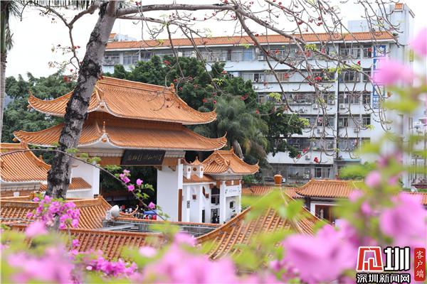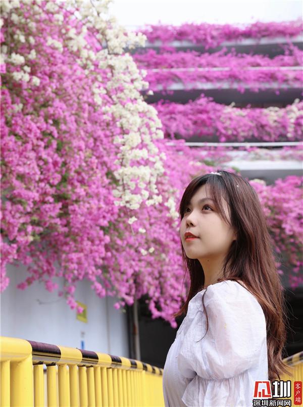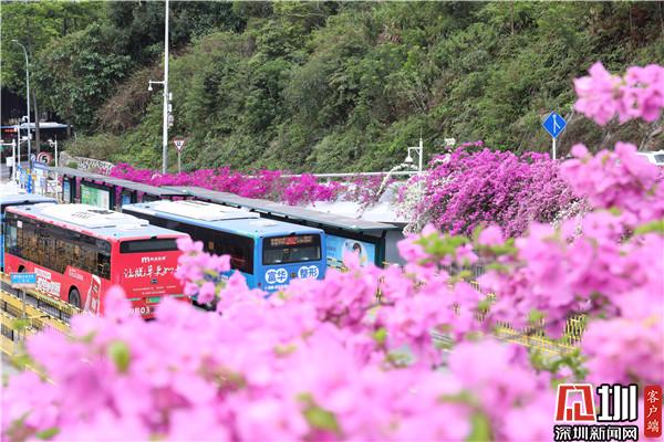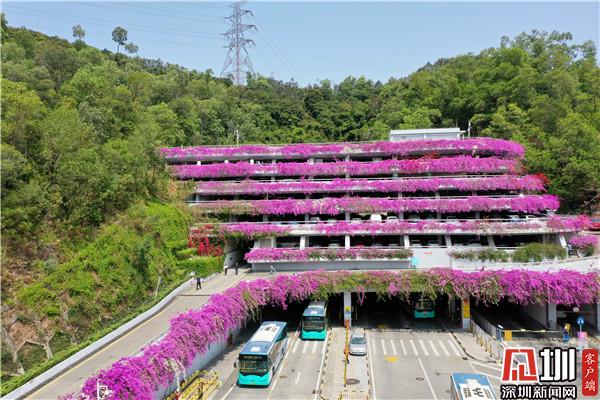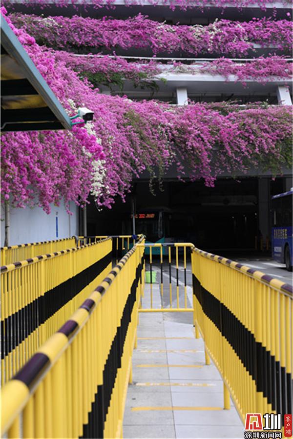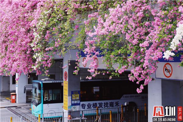 三月末,春深處,粉紫色的花朵環(huán)繞著停車場(chǎng)肆意綻放,與深圳藍(lán)相映成趣。
