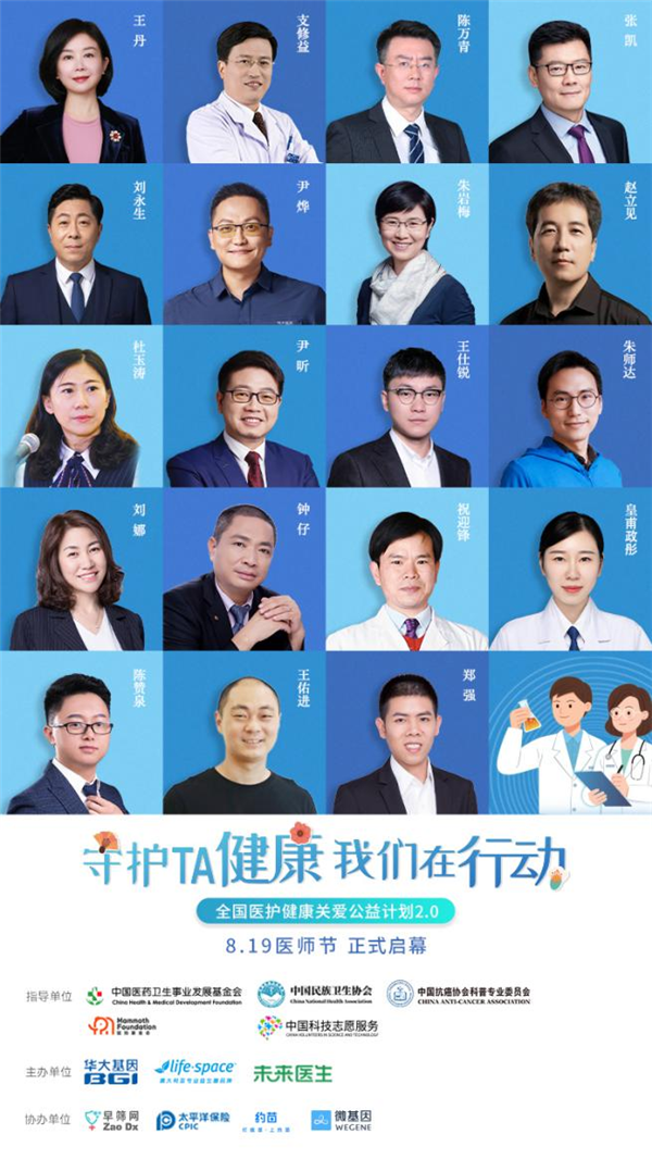 此次公益由中國醫(yī)藥衛(wèi)生事業(yè)發(fā)展基金會、中國民族衛(wèi)生協(xié)會、中國抗癌協(xié)會科普專業(yè)委員會、深圳猛犸公益基金會等機構(gòu)指導,華大基因、Life-Space、未來醫(yī)生聯(lián)合主辦,早篩網(wǎng)、太平洋保險、約苗、微基因協(xié)辦,通過健康關(guān)懷禮包捐贈、公益科普直播、線上義診等系列活動,呼吁全社會關(guān)愛醫(yī)護人員,助力全社會形成“尊醫(yī)重衛(wèi)”的文化和氛圍;同時借助公益影響力,讓關(guān)愛輻射更廣泛人群,提高全民“早篩、早診、早治”的健康意識,助力健康中國。