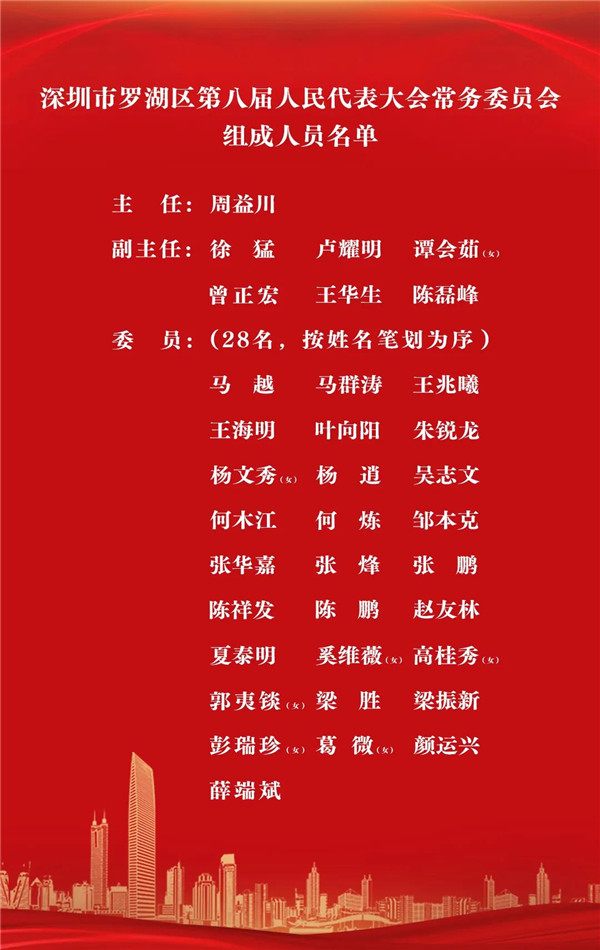 經(jīng)會(huì)議選舉,周益川當(dāng)選羅湖區(qū)第八屆人大常委會(huì)主任,范德繁當(dāng)選羅湖區(qū)人民政府區(qū)長,姚文勝當(dāng)選羅湖區(qū)監(jiān)察委員會(huì)主任。徐猛、盧耀明、譚會(huì)茹、曾正宏、王華生、陳磊峰當(dāng)選羅湖區(qū)第八屆人大常委會(huì)副主任。左金平、夏東、于紅軍、馮健、肖嘉睿、詹輝、霍廣勇當(dāng)選羅湖區(qū)人民政府副區(qū)長。楊爽當(dāng)選羅湖區(qū)人民法院院長。張彬當(dāng)選羅湖區(qū)人民檢察院檢察長,根據(jù)法律規(guī)定,須報(bào)經(jīng)市人民檢察院檢察長提請(qǐng)市人大常委會(huì)批準(zhǔn)。獲頒當(dāng)選證書后,新當(dāng)選人員向憲法宣誓就職。