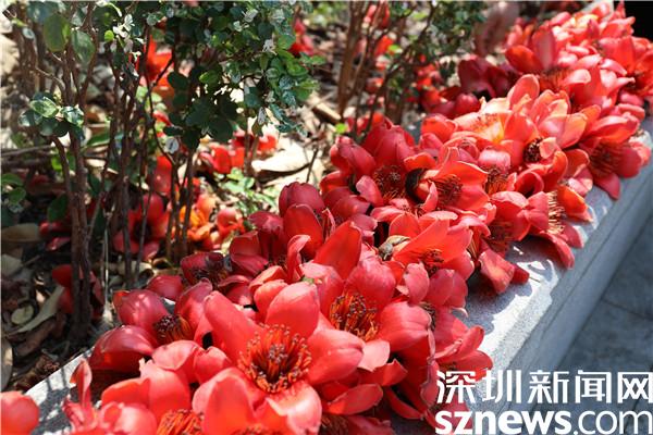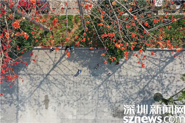 赤焰灼灼的木棉花開(kāi)了,染紅了轄區(qū)半邊天際,與深圳藍(lán)相映成趣。一朵朵嫣紅的花兒垂?jié)M枝頭,沐浴著暖春的陽(yáng)光綻放,也點(diǎn)綴著花下賞花的居民們。