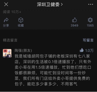 記者注意到,陶先生讓外賣小哥免費吃包子,最早引發(fā)關注,是源自疫情特殊時期他在深圳衛(wèi)健委下的一條留言:“外賣小哥在用1.5倍速播放,忙到他們想吃口飯都很麻煩,可能忙到沒時間等一份炒菜,我們所有門店給外賣小哥提供免費的包子,能吃多少拿多少,不用客氣。”