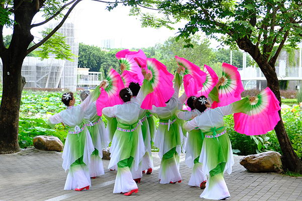 走進(jìn)公園,映入眼簾的是一望無(wú)際的荷葉。一陣微風(fēng)拂過(guò),嫩綠的蓮蓬輕輕點(diǎn)頭,碩大的荷葉隨風(fēng)搖擺,讓人心曠神怡。荷塘邊,身著紅色連衣裙的阿姨們正隨著音樂(lè)舞動(dòng);池塘的另一頭,身著碧綠服裝的阿姨們熱情洋溢地表演著扇子舞。
