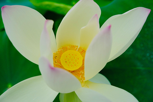綻放的荷花,粉白的花瓣一瓣一瓣向外舒展,花蕊仰著嫩黃的小臉,含笑地向你看來(lái)。