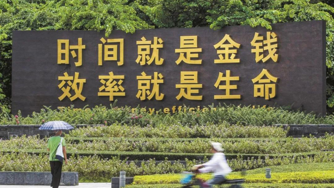蛇口時(shí)間廣場(chǎng)上矗立著“時(shí)間就是金錢,效率就是生命”標(biāo)語牌