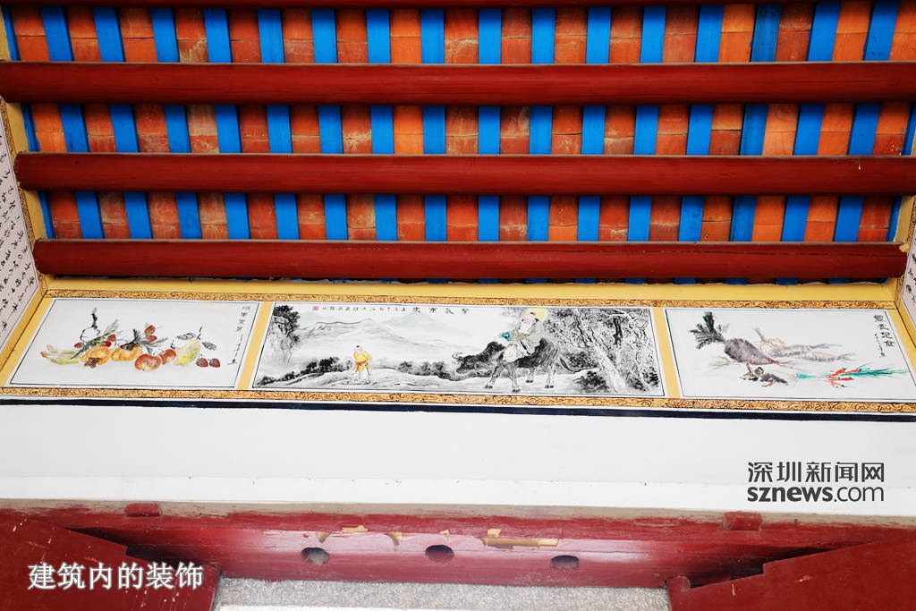 客家圍屋被稱為“東方城堡”,西埔新居的建造者們同樣也嚴(yán)格遵循古法“造城”,近3米高的白褐色外墻將99間房屋圍成一個(gè)方形堡壘,如同一座城堡。圍屋核心的李氏宗祠歷經(jīng)歲月洗禮,屋頂飛檐飾以仙鶴、麒麟、鹿等吉祥物,外壁上繪著山水畫(huà),宗祠內(nèi)雕梁畫(huà)棟。以李氏祠堂為中軸線,左右對(duì)稱的99間居民房屋成行成列。圍屋內(nèi)巷道縱橫交錯(cuò),居民家內(nèi)收拾得干干凈凈,很是整潔,門口還種有花草,生活的樂(lè)趣撲面而來(lái)。