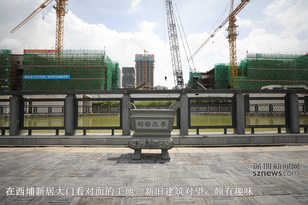 我們到訪西埔新居的時(shí)候,周邊的工地正如火如荼開(kāi)工,運(yùn)送建筑材料的貨車從西埔新居一側(cè)的通道進(jìn)進(jìn)出出,站在圍屋前的半月形池塘,就可看到高大的吊車和迅速長(zhǎng)高的現(xiàn)代樓宇,村里安靜,村外喧囂,兩個(gè)世界。