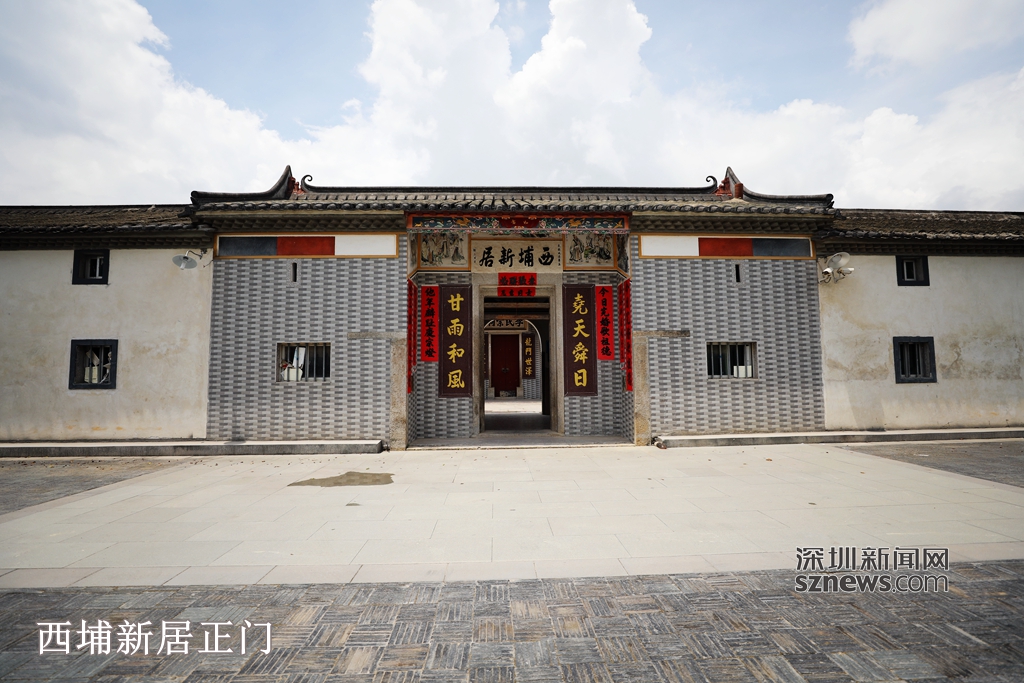 2017年8月的一天,深圳新聞網(wǎng)記者探訪西埔新居,在龍崗“三館一城(公共藝術(shù)館、科技館、青少年宮、圖書(shū)館)”的工地包圍中,我們從萬(wàn)科天譽(yù)學(xué)校的側(cè)門,走過(guò)一段小路,終于看到一半月形的池塘,找到了西埔新居。一位老奶奶正在西埔新居前的空地散步,她指給我們進(jìn)入新居的入口,正門兩側(cè)的對(duì)聯(lián)“堯天舜日,甘雨和風(fēng)”頗具古風(fēng),又有天下情懷。