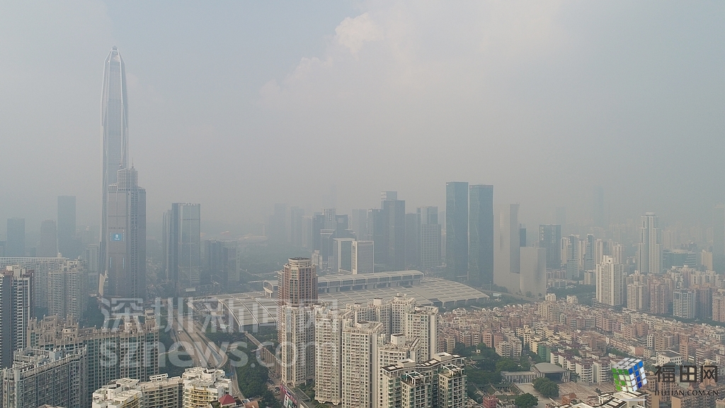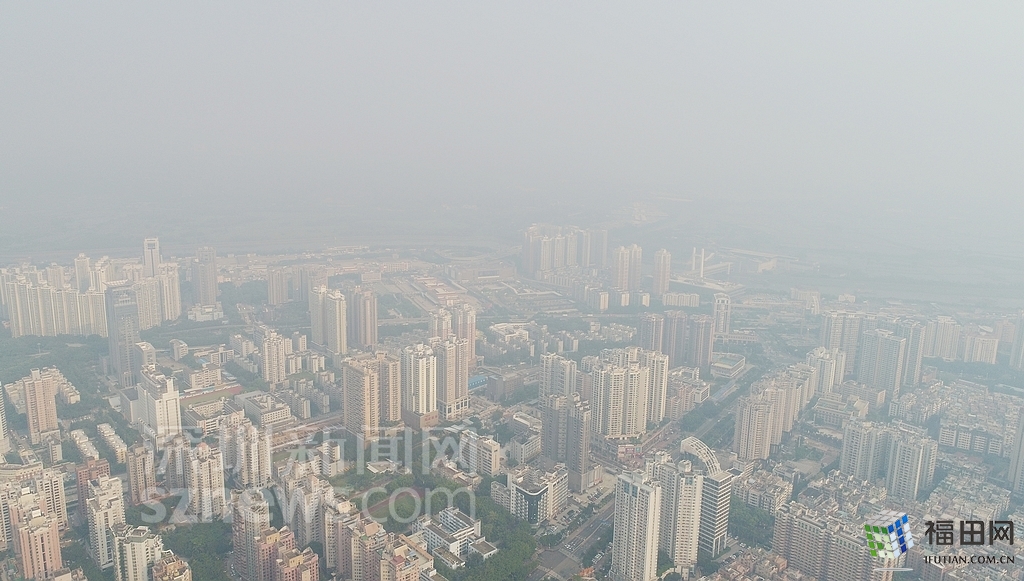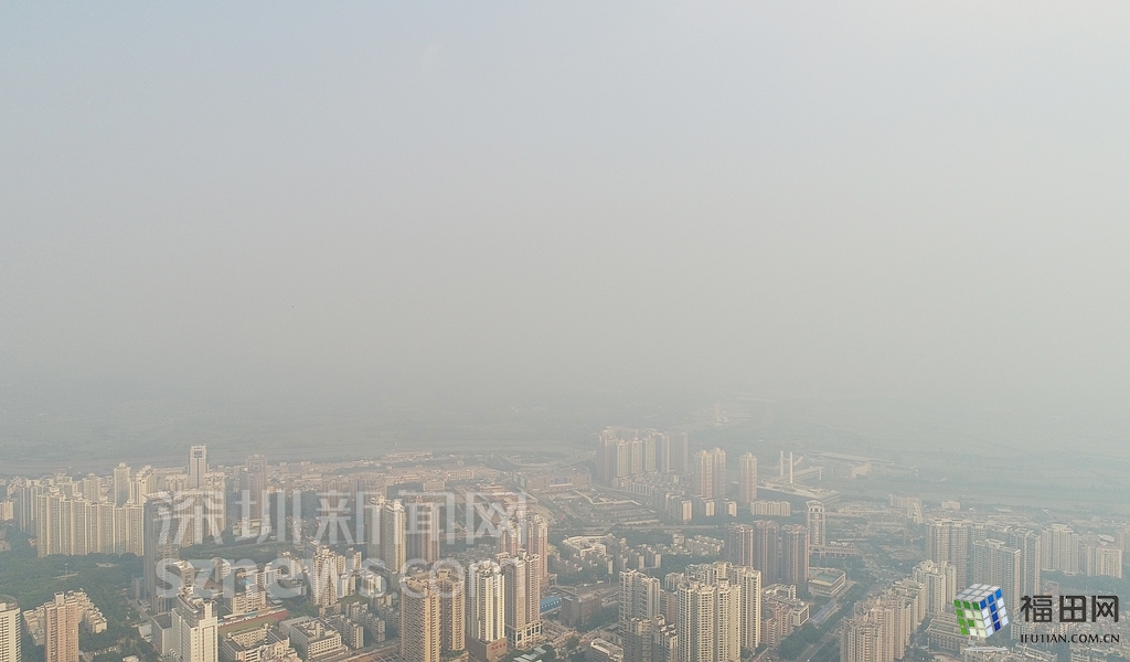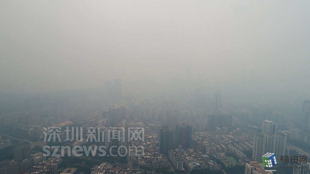 無人機在數(shù)百米高空俯瞰灰霾籠罩下的深圳中心區(qū),大半個城區(qū)都看不清楚。