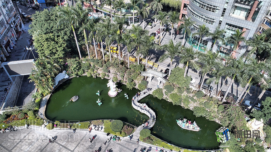 附近居民來到文化廣場前的池子投喂錦鯉。