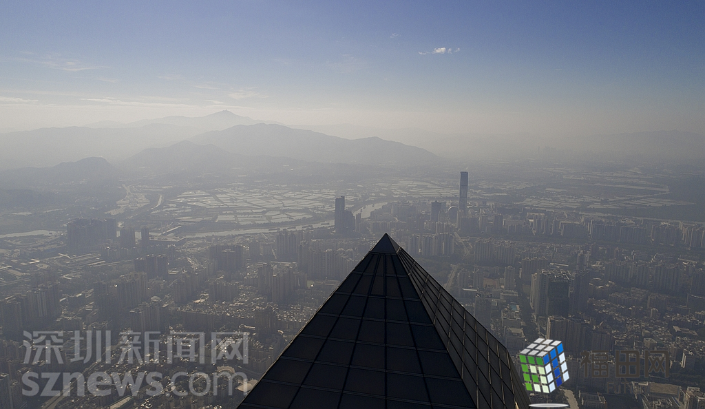 1月18日上午,記者操控?zé)o人機(jī)俯瞰深圳中心區(qū)發(fā)現(xiàn),灰霾將天空“割裂”成一道涇渭分明的界線,把城市籠罩得如同一個(gè)充滿霧靄的森林。從平安金融大廈的上空遠(yuǎn)眺,西南面的深圳灣在灰霾的籠罩下變成了一片“沙漠”,東面的京基一百幾乎被灰霾“吞沒”,北邊平時(shí)肉眼可看的梅林山也因?yàn)槟芤姸容^低變得若隱若現(xiàn),南面的米埔濕地也被云遮霧繞。