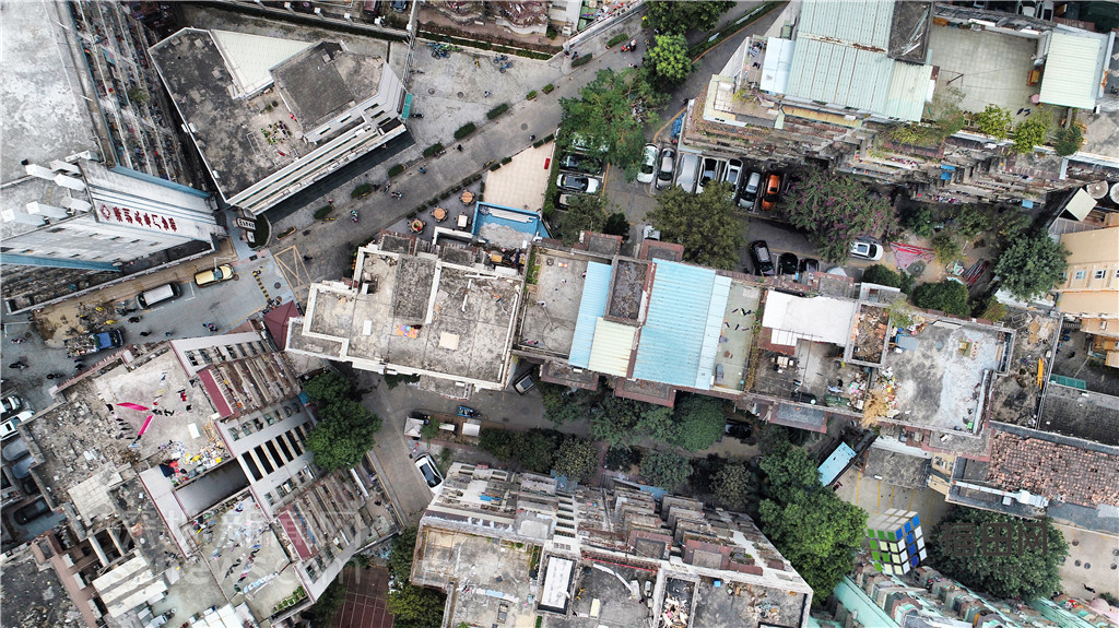 從無人機(jī)視野中,村內(nèi)房屋雖然擁擠,但綠化很好。