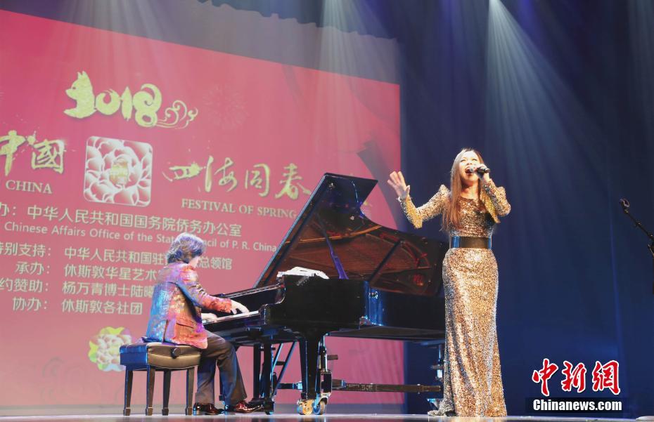當?shù)貢r間2月25日晚,2018年“文化中國·四海同春”藝術團在美國南部城市休斯敦舉行慰僑綜藝晚會。圖為中國知名歌手蔡國慶獻唱《同一首歌》。休斯敦是2018年“文化中國·四海同春”藝術團赴美演出的首站,獲得休斯敦華人華僑的熱情回應。其后,該藝術團還將奔赴美國奧蘭多、舊金山、芝加哥演出。中新社記者曾靜寧 攝