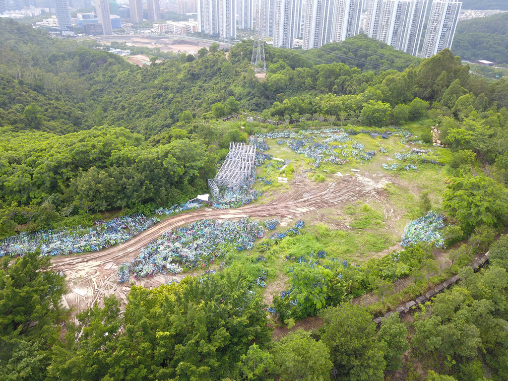 從高空俯瞰,安托山山頂?shù)墓蚕韱诬嚩逊e無序、且周圍雜草叢生,猶如一片共享單車“墳場(chǎng)”
