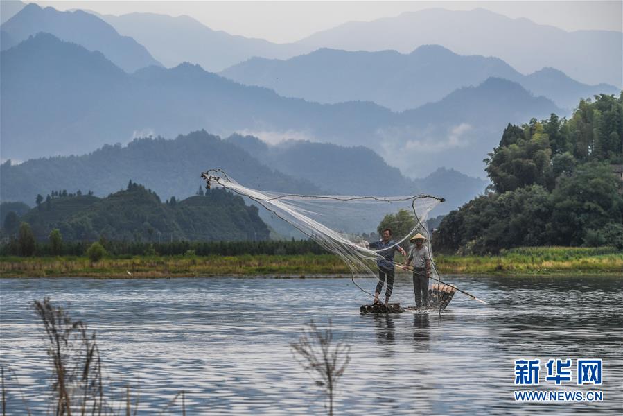 8月1日,淳安縣汾口鎮(zhèn)紅星村的漁民乘著竹排,在千島湖的支流武強溪上進行撒網(wǎng)捕撈作業(yè)。 新華社記者 徐昱 攝