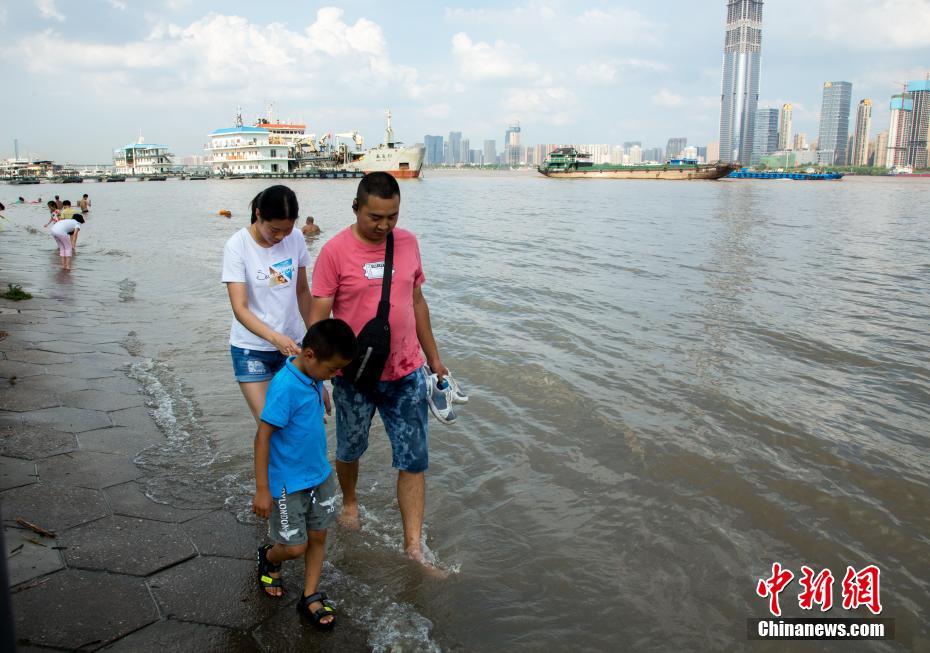 不少武漢市民在漢口江灘江邊戲水游玩。中新社記者 張暢攝