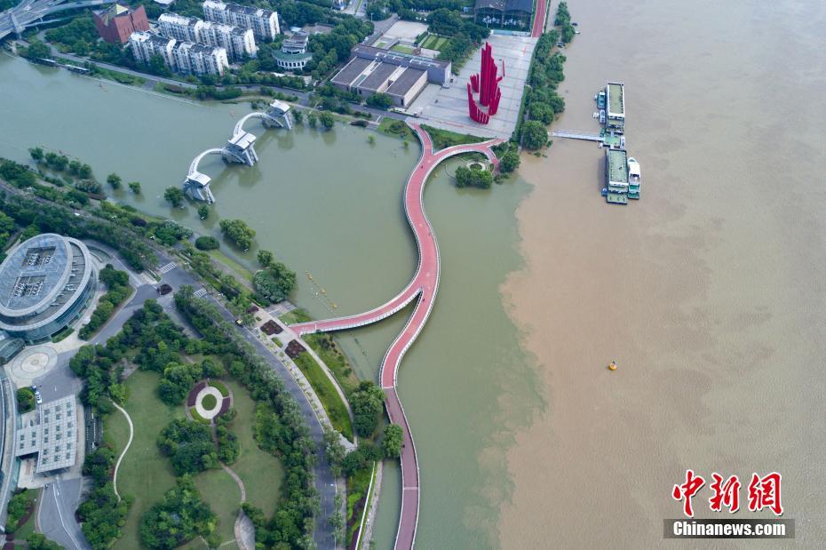 7月10日,航拍長(zhǎng)江與南京秦淮河交匯處,江水與河水“涇渭分明”。當(dāng)日,江蘇水利廳發(fā)布的水情信息顯示,長(zhǎng)江南京段水位已降至警戒線以下。中新社記者泱波 攝