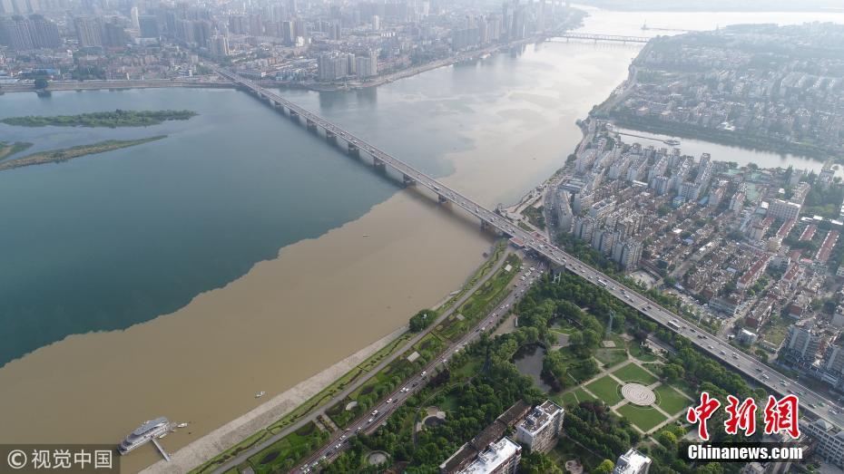 5月7日,湖北省襄陽(yáng)市,無(wú)人機(jī)航拍的漢江長(zhǎng)虹大橋處涇渭分明的漢江水面。強(qiáng)暴雨沖刷經(jīng)過(guò)去冬今春的田野地表積累的塵土,經(jīng)支流與主河道匯入時(shí),充滿污泥的洪水與主河道上清澈的丹江水形成難得一見的涇渭分明景觀。王虎攝 圖片來(lái)源:視覺(jué)中國(guó)