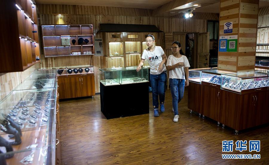 8月3日,前來(lái)體驗(yàn)銀飾制作的青少年參觀龍?zhí)?yáng)的銀飾陳列展臺(tái)。