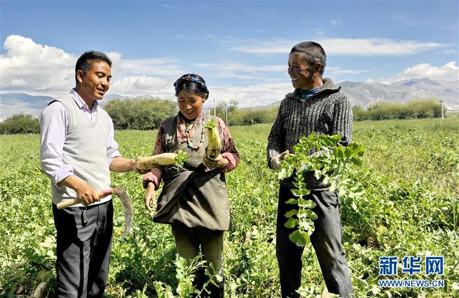 8月8日,在邊雄鄉(xiāng)普夏村蘿卜種植基地,白瑪梅朵合作社董事長加措(左)和收獲蘿卜的村民交流。 新華社記者 張汝鋒 攝