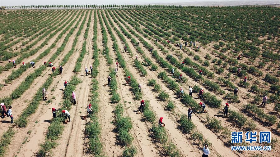 紅寺堡生態(tài)移民區(qū)的移民在百瑞源枸杞種植基地采摘頭茬枸杞(5月30日無人機拍攝)。近日,在寧夏吳忠市紅寺堡區(qū)百瑞源枸杞種植基地,頭茬枸杞迎來采摘收獲季。今年頭茬枸杞采摘期比往年提前20天左右。據(jù)了解,該基地地處紅寺堡生態(tài)移民區(qū),占地3000畝,采摘季節(jié)每天有數(shù)百名當?shù)匾泼裨谔镩g采摘勞作。新華社記者王鵬 攝