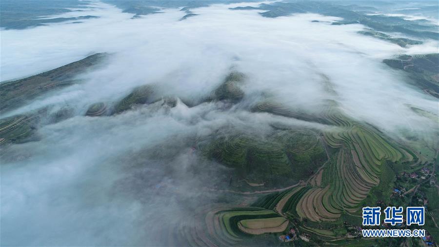 云霧繚繞的寧夏彭陽縣金雞坪梯田公園(7月17日無人機(jī)拍攝)。 新華社記者 王鵬 攝