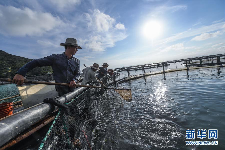 8月18日,南麂島海域的“海上牧場”養(yǎng)殖區(qū)內(nèi),漁民正捕撈大黃魚,處于仿生養(yǎng)殖環(huán)境的大黃魚需要生長2至3年。進(jìn)入8月,浙江省溫州市平陽縣南麂鎮(zhèn)海域上大片的大黃魚、貽貝等特色海產(chǎn)品養(yǎng)殖區(qū)域迎來豐收季節(jié),養(yǎng)殖戶們駕駛漁船在養(yǎng)殖區(qū)海域進(jìn)行打撈收獲,在碧海藍(lán)天下構(gòu)成了一幅“海上牧場”的美麗豐收景象。近年來,南麂鎮(zhèn)政府引導(dǎo)漁民養(yǎng)殖戶充分發(fā)揮“靠海吃?!钡馁Y源優(yōu)勢,大力發(fā)展海洋養(yǎng)殖經(jīng)濟(jì)和海島旅游經(jīng)濟(jì),實(shí)現(xiàn)了南麂由“生態(tài)美”向“產(chǎn)業(yè)美”,“產(chǎn)業(yè)美”向“經(jīng)濟(jì)美”的轉(zhuǎn)變。同時(shí)該鎮(zhèn)堅(jiān)持以大黃魚、貽貝等為特色產(chǎn)業(yè)支撐,精準(zhǔn)發(fā)展高效海洋養(yǎng)殖業(yè),重點(diǎn)培養(yǎng)一批新型職業(yè)漁民,依靠專業(yè)技術(shù)支持,實(shí)現(xiàn)深海仿生養(yǎng)殖,讓好生態(tài)造就好品質(zhì),重點(diǎn)打造南麂養(yǎng)殖品牌,組建營銷網(wǎng)絡(luò),拓展特色海產(chǎn)品市場。新華社記者 徐昱攝