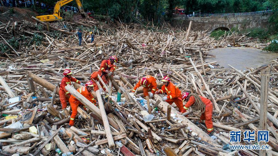 9月4日,當(dāng)?shù)厝罕娫诼槔跗驴h猛硐瑤族鄉(xiāng)壩子橋區(qū)域清理河道內(nèi)堆積的木材。當(dāng)日,云南麻栗坡山洪泥石流災(zāi)害救援工作繼續(xù)開(kāi)展,救援人員在現(xiàn)場(chǎng)全力搜尋失蹤人員。新華社發(fā)方超 攝 圖片來(lái)源:新華網(wǎng)