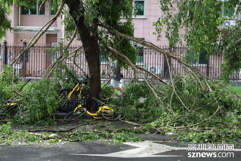 2018年9月17日10點16分,商報路,一對父子走過倒塌的樹木旁邊。(攝影:楊浩翰)