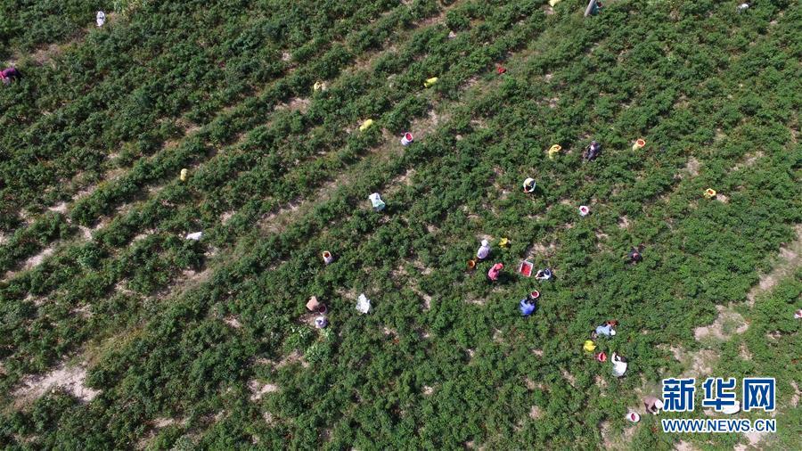 9月16日,阜城縣王集鄉(xiāng)南張莊村農(nóng)民在采摘辣椒(無人機拍攝)。近年來,河北省阜城縣王集鄉(xiāng)在推進產(chǎn)業(yè)富民過程中,積極引導農(nóng)民調(diào)整農(nóng)業(yè)產(chǎn)業(yè)結(jié)構(gòu),按照品種特色化、種植規(guī)模化、產(chǎn)銷一體化的“公司+基地+農(nóng)戶”的經(jīng)營模式,鼓勵農(nóng)民發(fā)展特色辣椒種植,推行“訂單種植”模式,開辟出了一條農(nóng)民創(chuàng)收新路徑。目前,阜城縣王集鄉(xiāng)辣椒種植面積3100余畝,每畝年收益2500元以上,帶動當?shù)剞r(nóng)民實現(xiàn)增收。新華社記者朱旭東攝