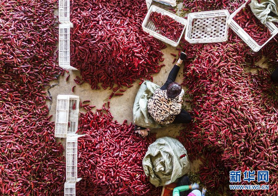 9月16日,阜城縣王集鄉(xiāng)南張莊村農(nóng)民在整理收獲的辣椒。近年來,河北省阜城縣王集鄉(xiāng)在推進產(chǎn)業(yè)富民過程中,積極引導農(nóng)民調(diào)整農(nóng)業(yè)產(chǎn)業(yè)結(jié)構(gòu),按照品種特色化、種植規(guī)?;a(chǎn)銷一體化的“公司+基地+農(nóng)戶”的經(jīng)營模式,鼓勵農(nóng)民發(fā)展特色辣椒種植,推行“訂單種植”模式,開辟出了一條農(nóng)民創(chuàng)收新路徑。目前,阜城縣王集鄉(xiāng)辣椒種植面積3100余畝,每畝年收益2500元以上,帶動當?shù)剞r(nóng)民實現(xiàn)增收。新華社記者朱旭東攝