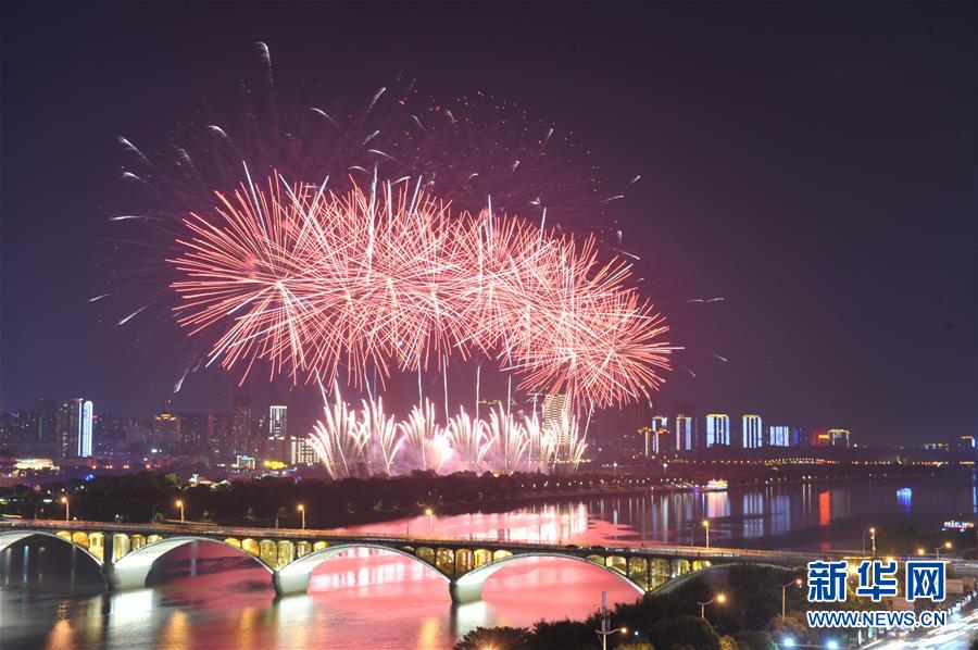 9月19日晚,湖南省長沙市在湘江橘子洲舉辦焰火晚會(huì),絢麗的焰火與湘江兩岸的城市夜景交相輝映。