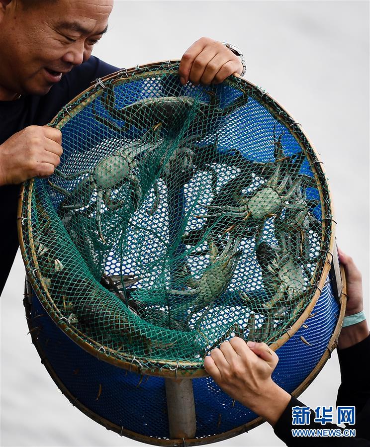 9月21日,蟹農(nóng)展示剛捕撈到的陽澄湖大閘蟹。新華社記者李響攝