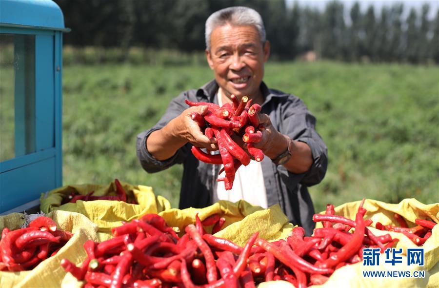 9月16日,阜城縣王集鄉(xiāng)南張莊村農(nóng)民在展示采摘的辣椒。近年來,河北省阜城縣王集鄉(xiāng)在推進產(chǎn)業(yè)富民過程中,積極引導(dǎo)農(nóng)民調(diào)整農(nóng)業(yè)產(chǎn)業(yè)結(jié)構(gòu),按照品種特色化、種植規(guī)?;a(chǎn)銷一體化的“公司+基地+農(nóng)戶”的經(jīng)營模式,鼓勵農(nóng)民發(fā)展特色辣椒種植,推行“訂單種植”模式,開辟出了一條農(nóng)民創(chuàng)收新路徑。目前,阜城縣王集鄉(xiāng)辣椒種植面積3100余畝,每畝年收益2500元以上,帶動當?shù)剞r(nóng)民實現(xiàn)增收。新華社記者朱旭東攝