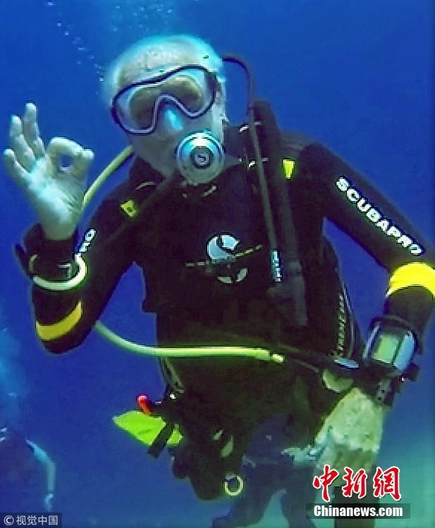 當地時間2018年9月1日,塞浦路斯,95歲的英國潛水員雷·伍利(Ray Woolley)以44分鐘下潛40.5米的成績打破了自己94歲達成的記錄(41分鐘下潛38.1米),二度刷新了世界上年齡最大的男性潛水員最好成績。在此次下潛中,這位二戰(zhàn)退伍老兵對距塞浦路斯南部城鎮(zhèn)拉納卡約2公里處的海域進行了探索,1980年一艘名為“芝諾比亞號”(Zenobia)的貨船在這里進行首次航行時沉沒。圖片來源:視覺中國