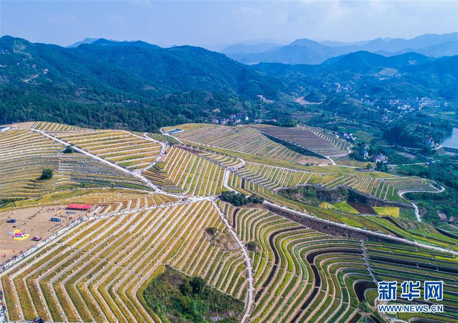9月29日,太極拳愛好者在建德市大洋鎮(zhèn)高垣村的千畝梯田上進行表演(無人機拍攝)。當日,2000多名太極拳愛好者在浙江省建德市大洋鎮(zhèn)高垣村的千畝梯田上參加太極拳表演,吸引很多當?shù)厝撕陀慰颓皝碛^賞,助力當?shù)亟鹎飼r節(jié)鄉(xiāng)村旅游。近兩年來,大洋鎮(zhèn)充分利用土地整治后形成的千畝梯田打造農(nóng)業(yè)觀光綜合體,發(fā)展綜合型農(nóng)業(yè)觀光旅游,為鄉(xiāng)村振興注入新活力。新華社記者徐昱攝