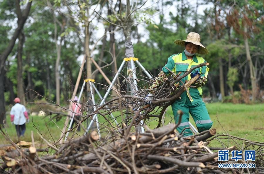 10月1日,工作人員在深圳街頭的綠化帶清理強(qiáng)臺風(fēng)“山竹”損毀的樹木。當(dāng)日是國慶節(jié),許多勞動(dòng)者堅(jiān)守在工作一線,在崗位上度過節(jié)日。新華社記者毛思倩攝