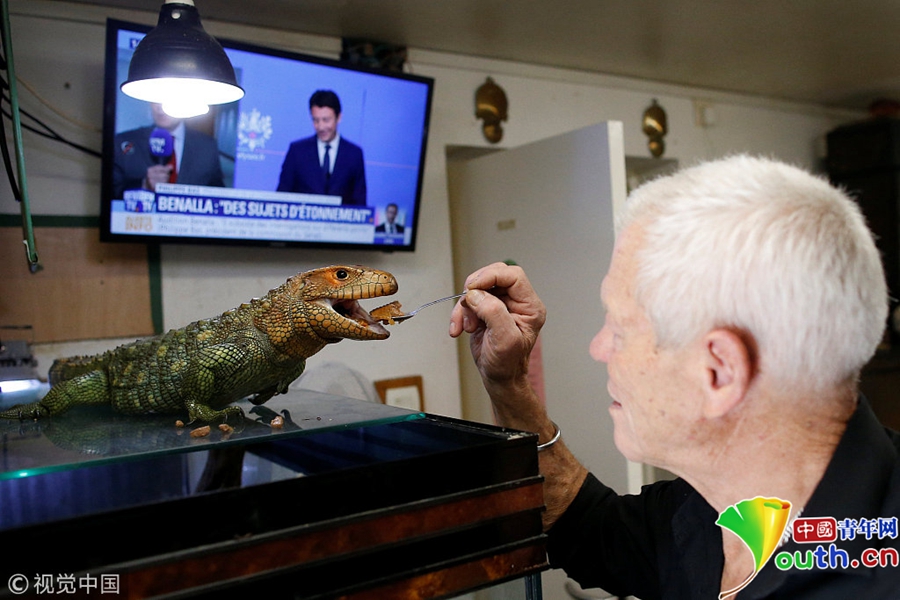用小湯匙喂蜥蜴。盡管Philippe Gillet的這些寵物看起來對他并無傷害,但是家里有400多只爬行動物遍布角落的感覺是什么樣,請自行體會。