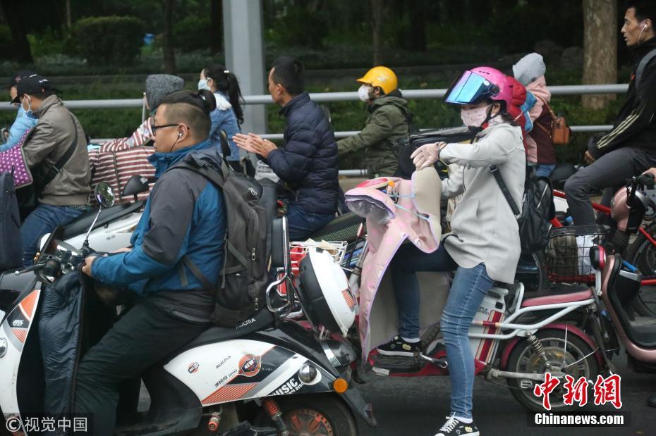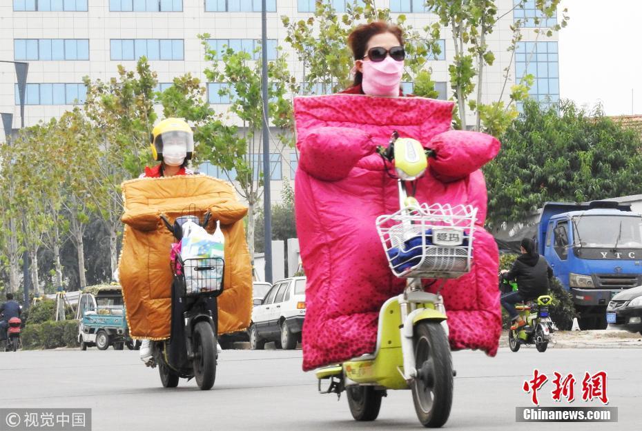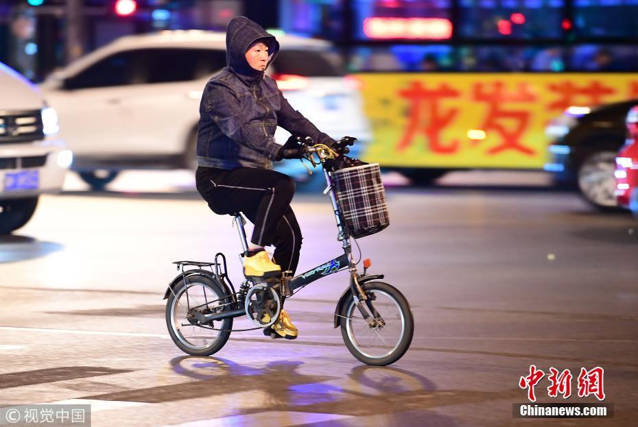 2018年10月9日,山東濟(jì)南,昨日一場(chǎng)秋雨過后開始降溫,今天清晨最低氣溫只有6度,馬路上不少上班族穿上羽絨服騎車趕上班路。 圖片來源:視覺中國(guó)