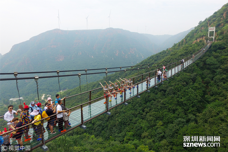 2018年6月30日,鄭州新密一景區(qū)的玻璃吊橋上,幾名美女大學生身穿“野人”服裝練習瑜伽,吸引了眾多游客的圍觀。據(jù)了解,這些大學生來自鄭州。