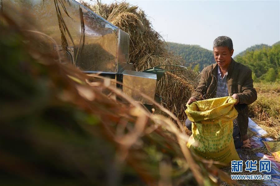 10月9日,一名村民在上堡鄉(xiāng)的高山梯田利用機(jī)械進(jìn)行脫粒裝袋。 新華社記者 胡晨歡 攝