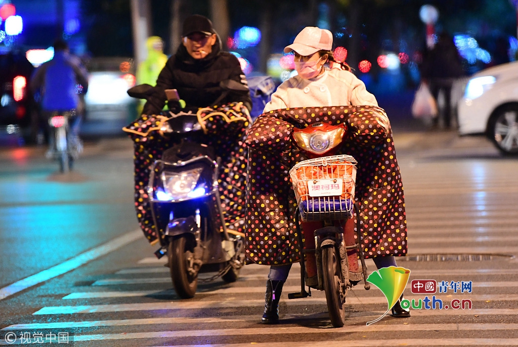 2018年10月9日,山東濟(jì)南,昨日一場(chǎng)秋雨過(guò)后開(kāi)始降溫,今天清晨最低氣溫只有6度,馬路上不少上班族穿上羽絨服騎車(chē)趕上班路。 圖片來(lái)源:視覺(jué)中國(guó)