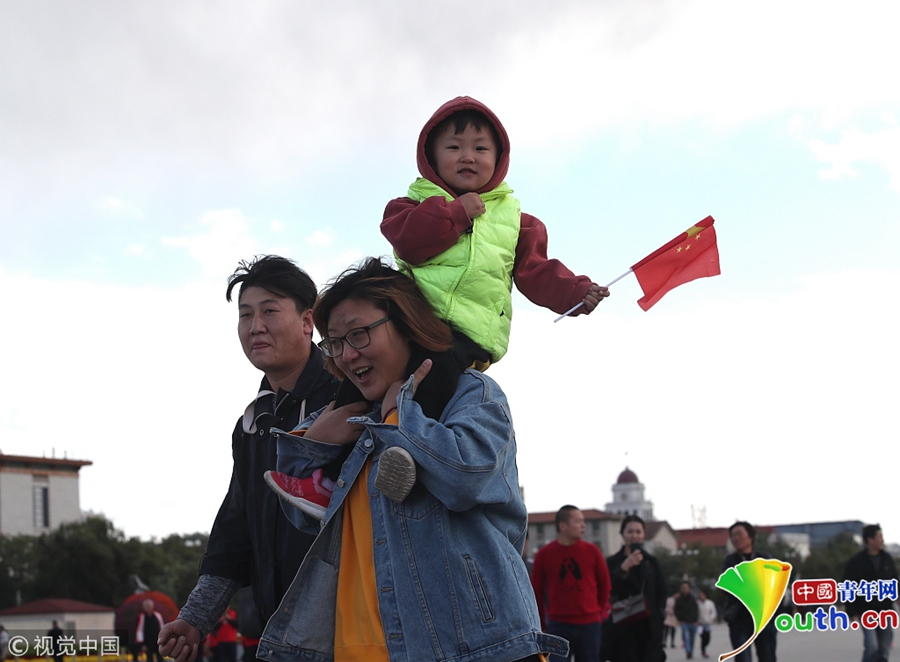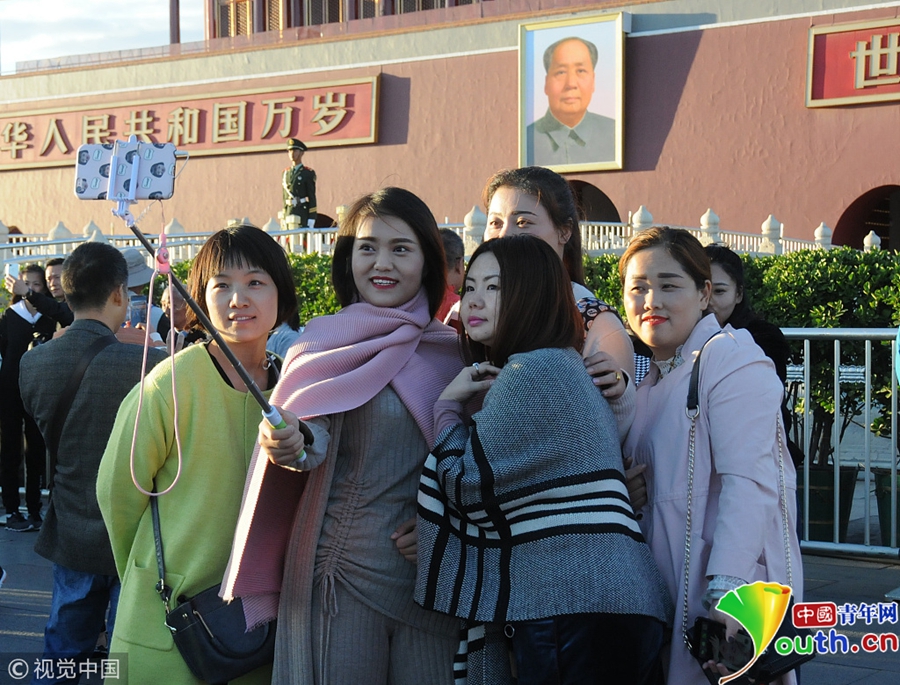 中國(guó)青年網(wǎng)北京10月10日電 2018年10月9日,北京,游客紛紛著秋冬裝游覽天安門(mén)廣場(chǎng)。當(dāng)天北京冷空氣來(lái)襲。圖片來(lái)源:視覺(jué)中國(guó)