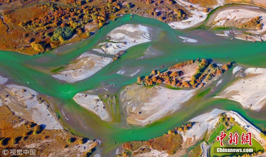 10月5日,新疆巴音郭楞,流過(guò)新疆和靜縣巴潤(rùn)哈爾莫敦鎮(zhèn)的開(kāi)都河秋景(無(wú)人機(jī)拍攝)。 圖片來(lái)源:視覺(jué)中國(guó)